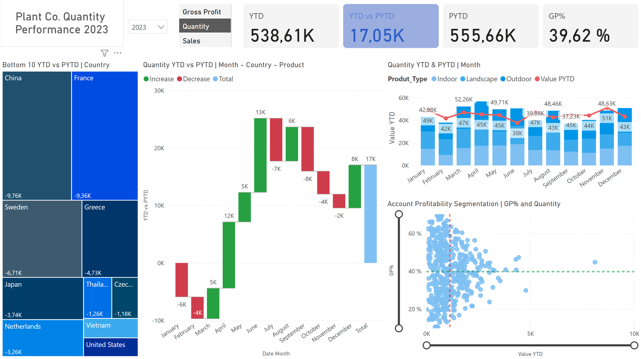 To address this, we built a dashboard that puts the spotlight on the bottom 10 countries, making underperformance impossible to overlook. A waterfall chart illustrates how each market contributes to the overall result, while a scatterplot allows users to drill deeper into patterns and outliers. At the top, key indicators show Year-to-Date (YTD) versus Prior Year-to-Date (PYTD), with intuitive blue/red color coding to instantly signal positive or negative performance.